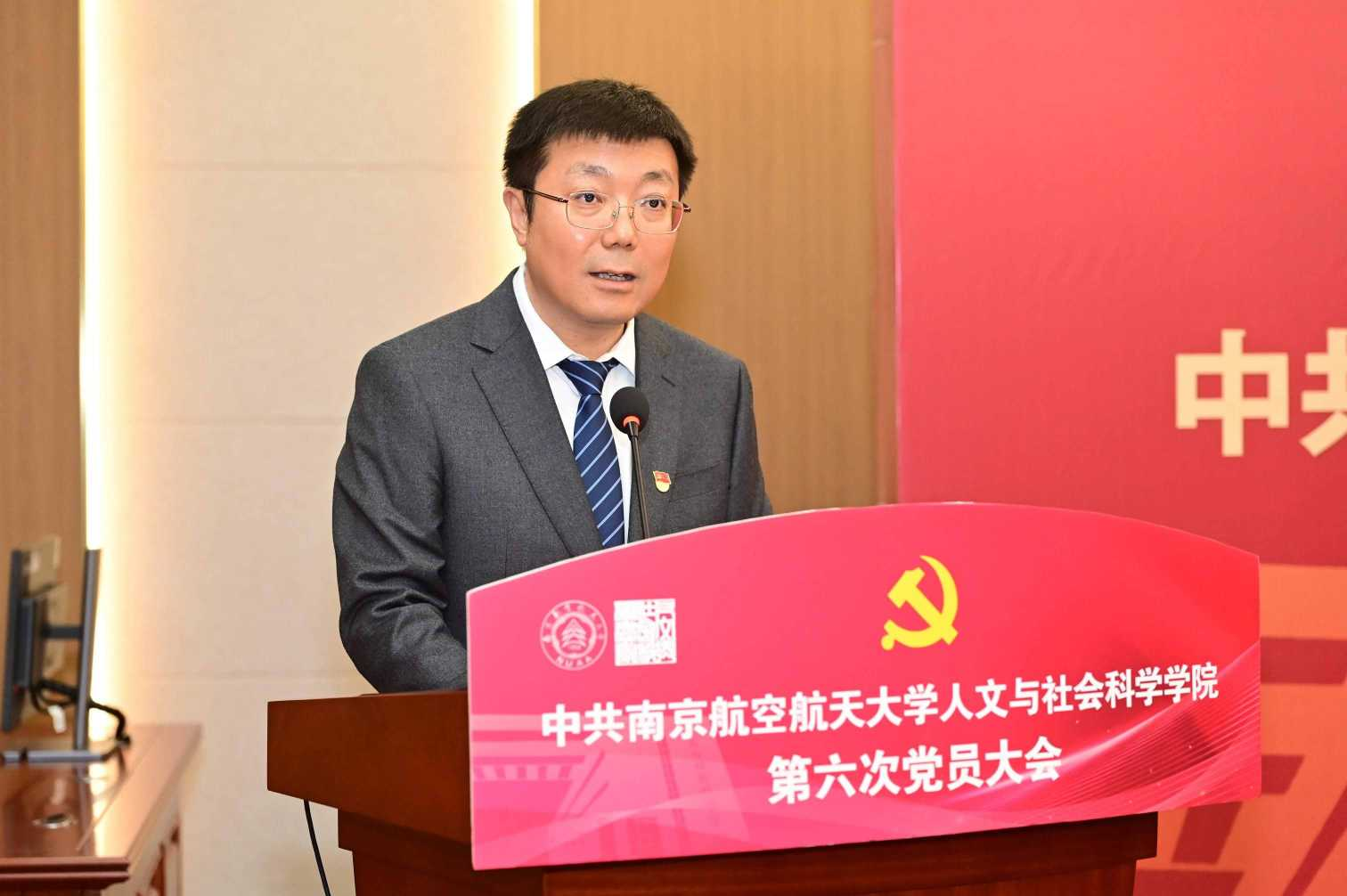 杭育新代表学校党委对大会的召开表示热烈祝贺,并对人文学院党委过去六年的工作成绩给予高度肯定。他强调,人文学院作为学校最资深的文科学院,在支撑学校建设世界一流大学、服务国家战略中肩负特殊使命。他对学院未来发展提出三点希望:一是要坚持政治引领,把准学院高质量发展的方向舵。把党的全面领导贯穿办学治院全过程、各方面,推动党建与事业发展“一融双高”落细落实,巩固风清气正的发展环境。二是要坚持内涵发展,提升学院高质量发展的核心力。要坚定不移走内涵式发展道路,坚持为党育人、为国育才,精准定位学科方向,全力提升人才队伍高端性,推动文化建设赋能学校发展,加大国际合作交流力度,不断提升学院核心竞争力与国际影响力。三是要坚持行稳致远,提振学院高质量发展的精气神。要切实落实学校第十七次党代会决策部署,层层压实责任,勇于破解发展中的瓶颈制约,全力实现学院的建设目标,为学校“双一流”建设和强国复兴伟业贡献更多南航人文力量。